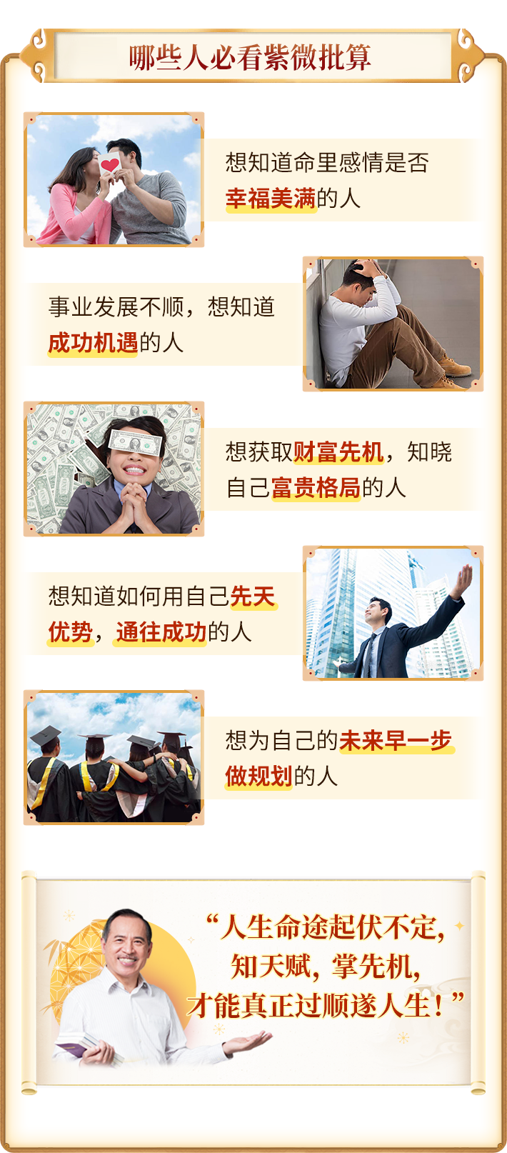 紫微斗数是东方中国最著名的占星学,利用人类出生时夏历时间进行斗数星盘的排列,将满天星曜飞布人生十二宫,并据以解释人生命运起伏,紫微斗数经老师团队多年研究,准确率高达95%!